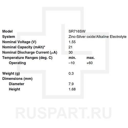 Батарейка кнопочная, оксид серебра RENATA SR716SWОписание: упаковка 10 шт