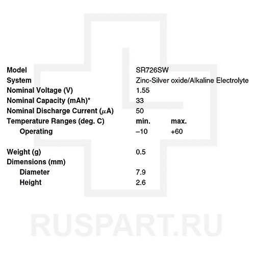 Батарейка кнопочная, оксид серебра RENATA SR726SWОписание: упаковка 10 шт