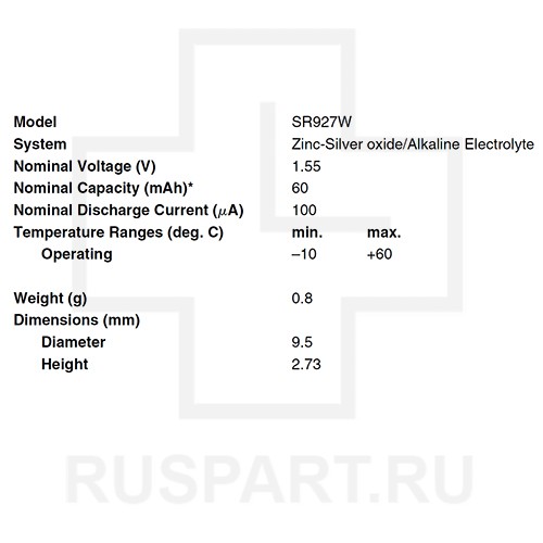 Батарейка кнопочная, оксид серебра RENATA SR927WОписание: упаковка 10 шт