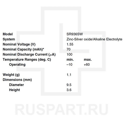 Батарейка кнопочная, оксид серебра RENATA SR936SWОписание: упаковка 10 шт